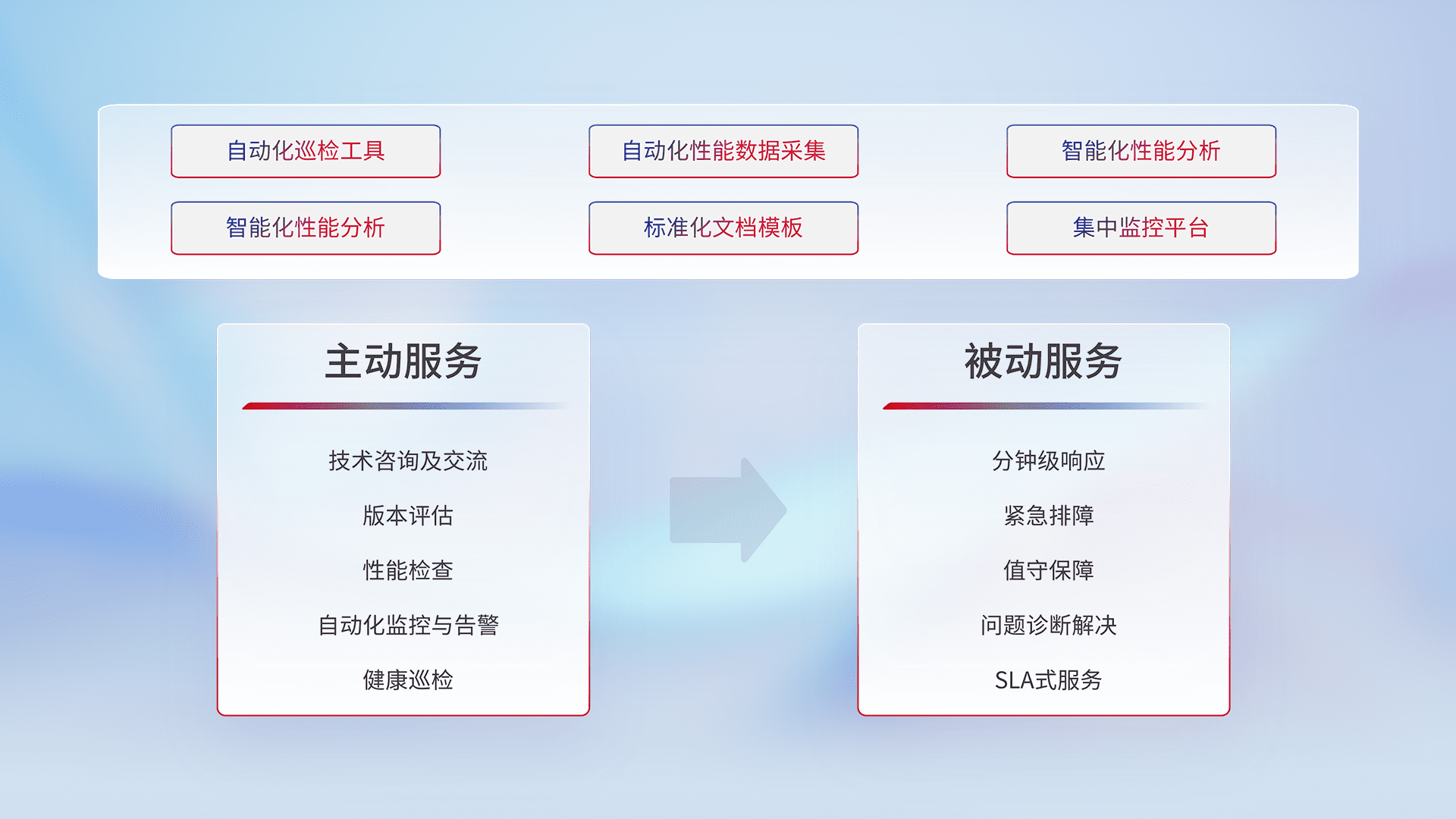 智能化工具和标准化文档,,,,保障服务质量,,提供主动服务(包含技术咨询、、、版本评估、、性能检查、、、、自动化监控与告警、、、、健康巡检)和被动服务包含(分钟级响应、、、、紧急排障、、值守保障、、、、问题诊断解决、、SLA服务)。。。。